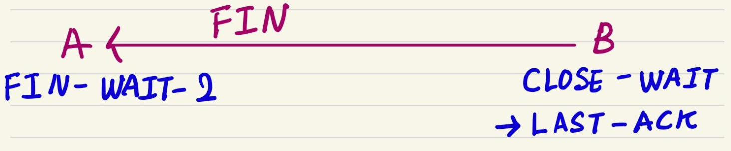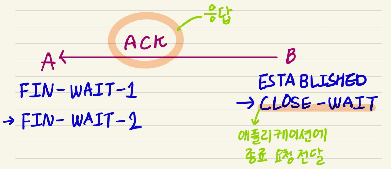 클라이언트는 A는 서버 B로부터 ACK 응답을 받으면서 서버 B의 연결 해제 요청을 기다리는 “FIN-WAIT-2” 상태로 변경된다.