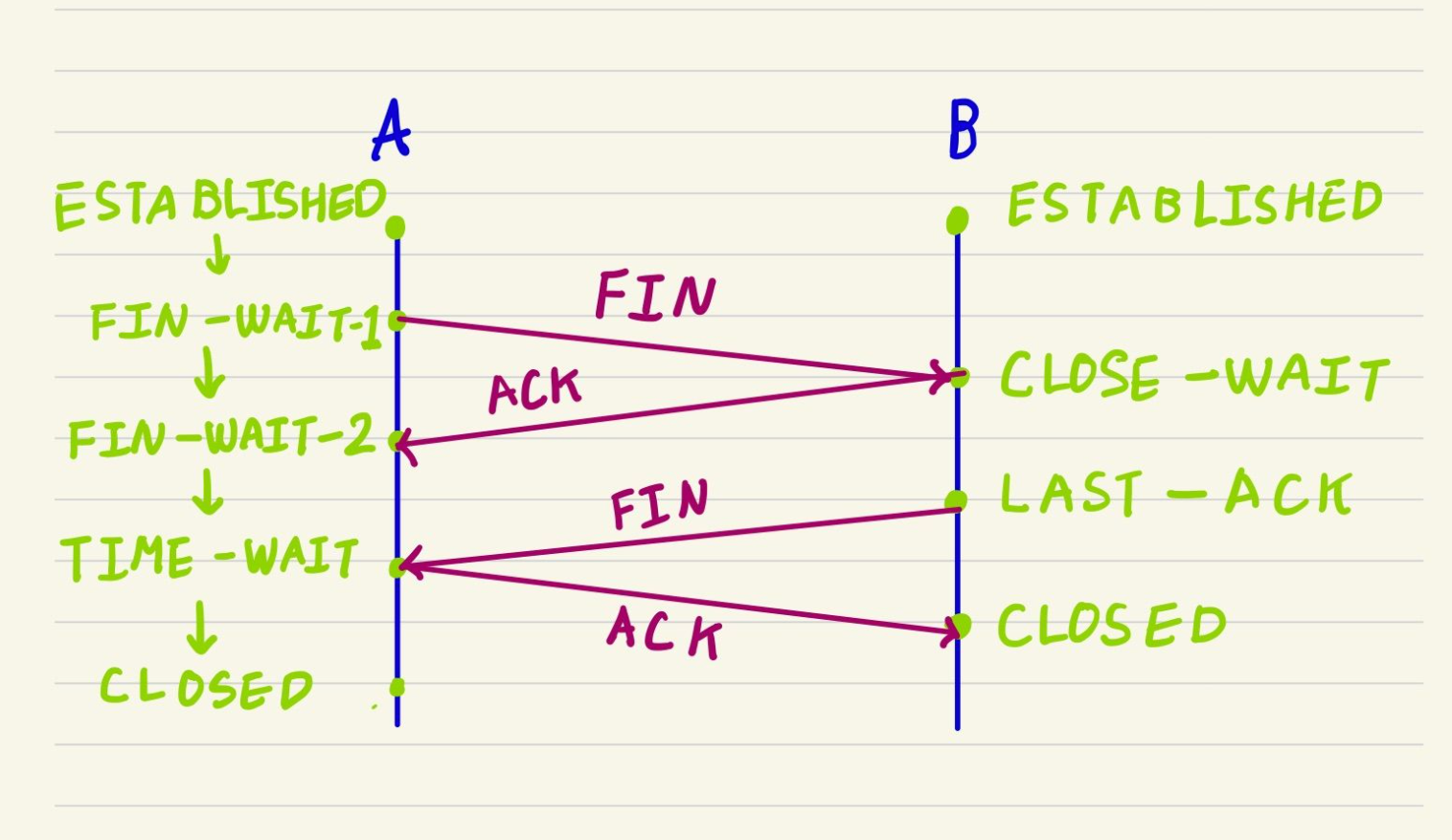 이런 예기치 못한 상황을 대비하기 위해 종료 요청을 한 쪽은 FIN 패킷을 받더라도 즉시 종료하지 않고 일정시간 동안 세션을 유지한 후 CLOSED 상태로 변경되는데 이 때 일정시간 세션을 유지하는 단계를 TIME-WAIT 단계라고 한다.