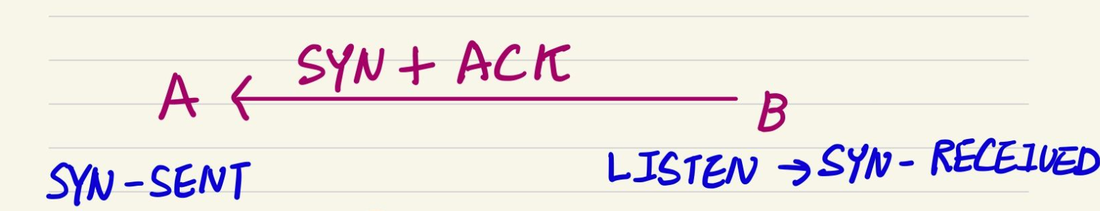 이 때, 서버 B는 연결 요청을 듣고 있는 “LISTEN” 상태에서 클라이언트 A에게 연결 요청을 정상적으로 받았다는 “SYN-RECIEVED” 상태로 변경된다.