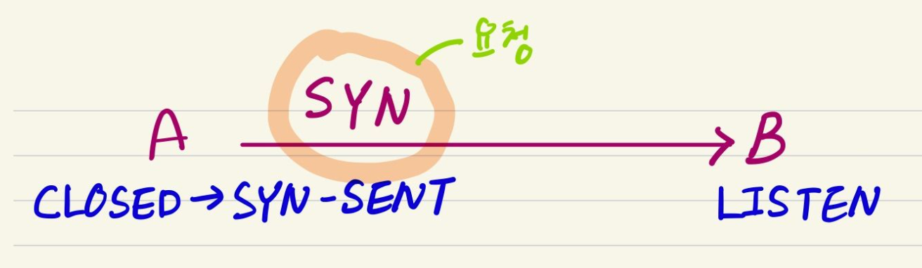 클라이언트 A는 연결하고자 하는 서버 B에게 연결을 요청하는 SYN 패킷을 전송한다.