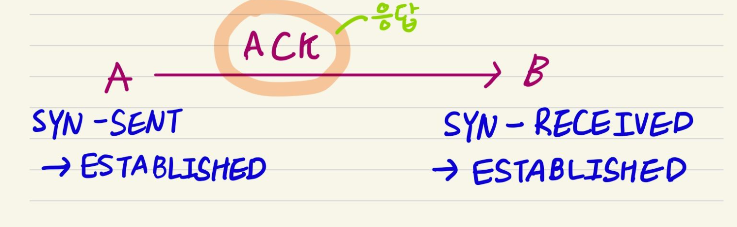 클라이언트 A는 서버 B에게 연결 요청을 수락하는 ACK 응답을 보내준다.