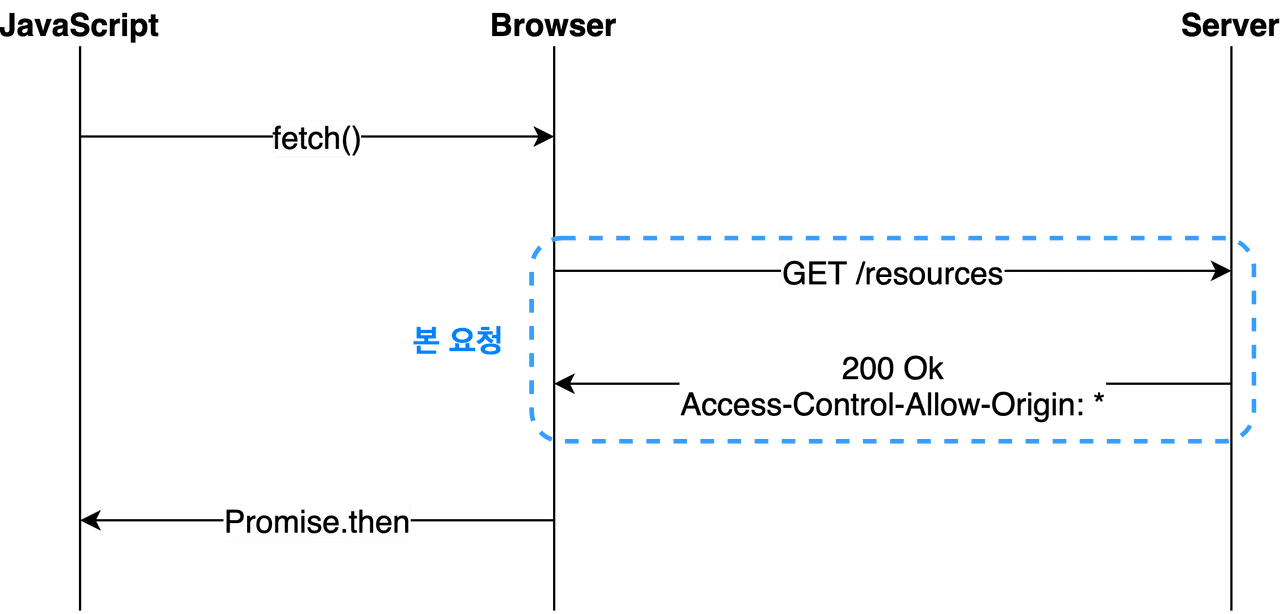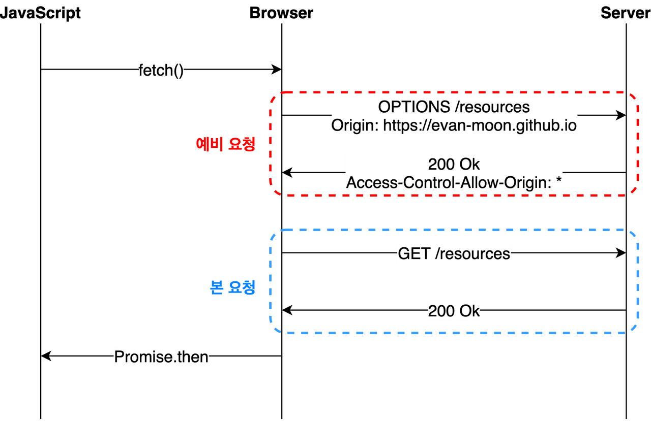 이렇게 본 요청 전에 브라우저와 서버 간 사전 요청을 통해 브라우저가 요청한 출처가 허가되면, 브라우저는 실제 본 요청을 통해 리소스를 획득한다.
