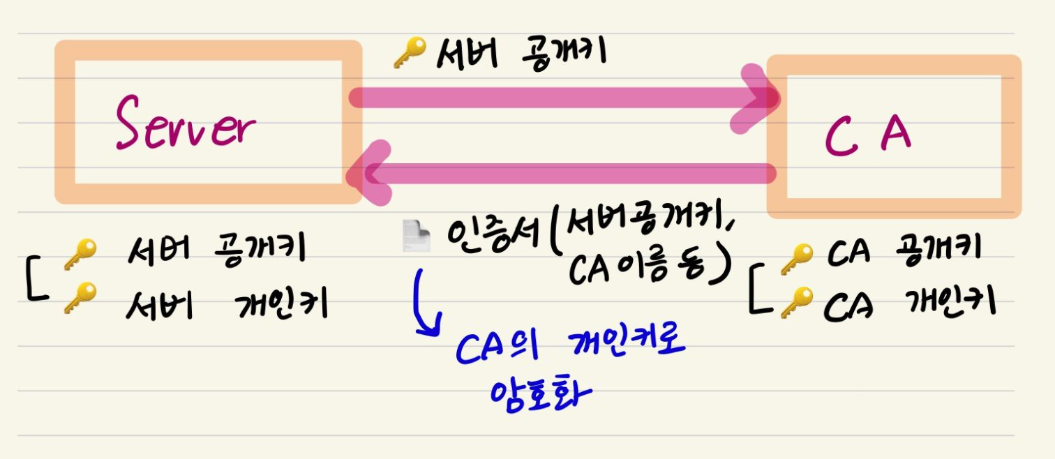 - 애플리케이션 서버는 인증된 CA와의 계약을 통해 서버의 공개키와 CA의 이름 등 정보를 CA의 개인키로 암호화한 인증서를 발급받는다.