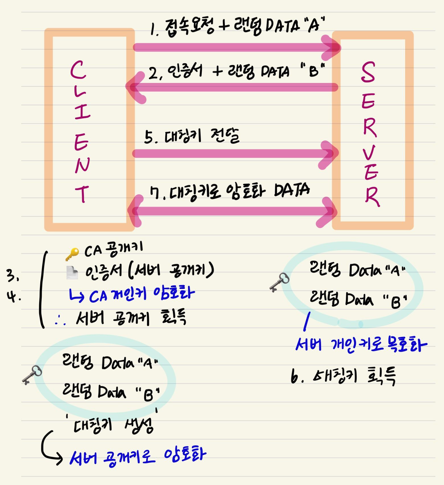 - 클라이언트는 자신이 생성해 서버에 보낸 랜덤 데이터 A와 서버가 생성한 랜덤 데이터 B를 이용해 대칭키를 생성하고 인증서를 복호화해 얻은 서버의 공개키로 해당 대칭키를 암호화해서 서버에 전달한다.